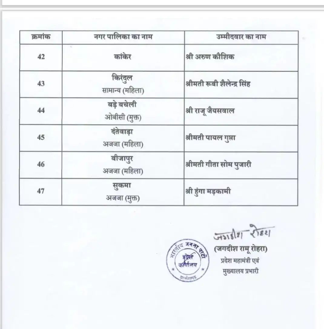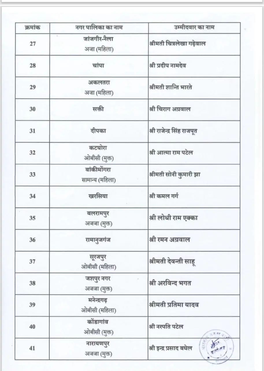 नगरीय निकाय चुनाव के लिए बीजेपी ने प्रत्याशियों की घोषणा कर दी है। 47 नगर पालिका अध्यक्ष प्रत्याशियों की घोषणा कर दी गई है।